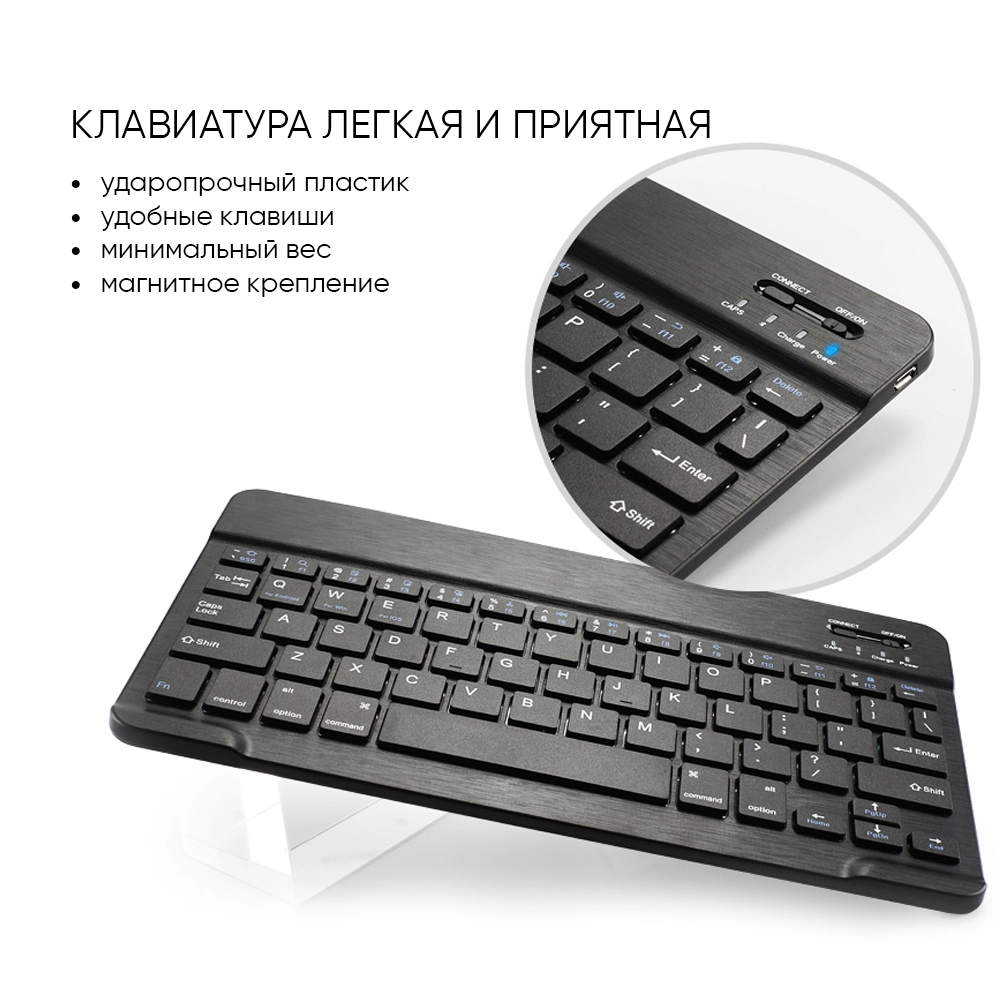 Материал изделия приятный на ощупь, чтобы вам было максимально комфортно и приятно использовать его. Аксессуар также позволяет планшету выполнять функцию автоматического засыпания и пробуждения. Достаточно вам открыть крышку обложки, как экран загорается, закрываете – и он угасает, переходя в ждущий режим. Разъемы и отверстия на обложке полностью соответствуют планшету, так что у вас не возникнет проблем с подключением других девайсов, изменением громкости или созданием фото и видео. Обложка черного цвета от AIRON отлично сочетается с приятной на ощупь, невероятно легкой клавиатурой. Компактное дополнение прикреплено к аксессуару при помощи магнитов. Так что не будет соскальзывать и выпадать при работе. Клавиатура синхронизируется с планшетом при помощи функции Bluetooth. Компактный стилус позволит вам набирать текст на клавиатуре дисплея более комфортно. Его наконечник изготовлен из мягкого материала, так что царапины и повреждения будут не страшны дисплею.