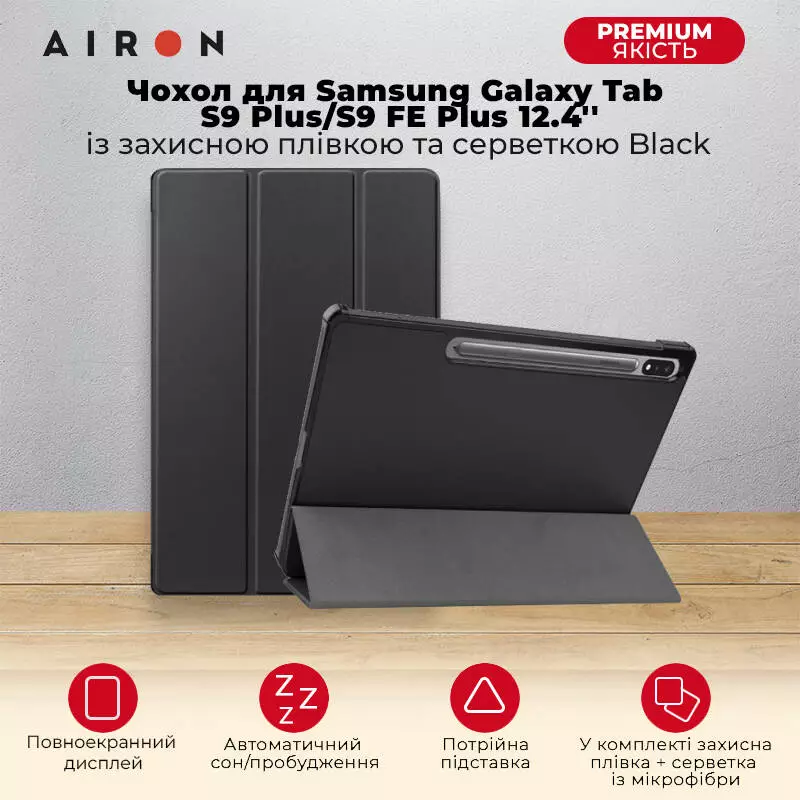 Чехол AIRON Premium Samsung Galaxy Tab S9 Plus/S9 FE Plus 12.4'' 2023 с защитной пленкой и салфеткой black
