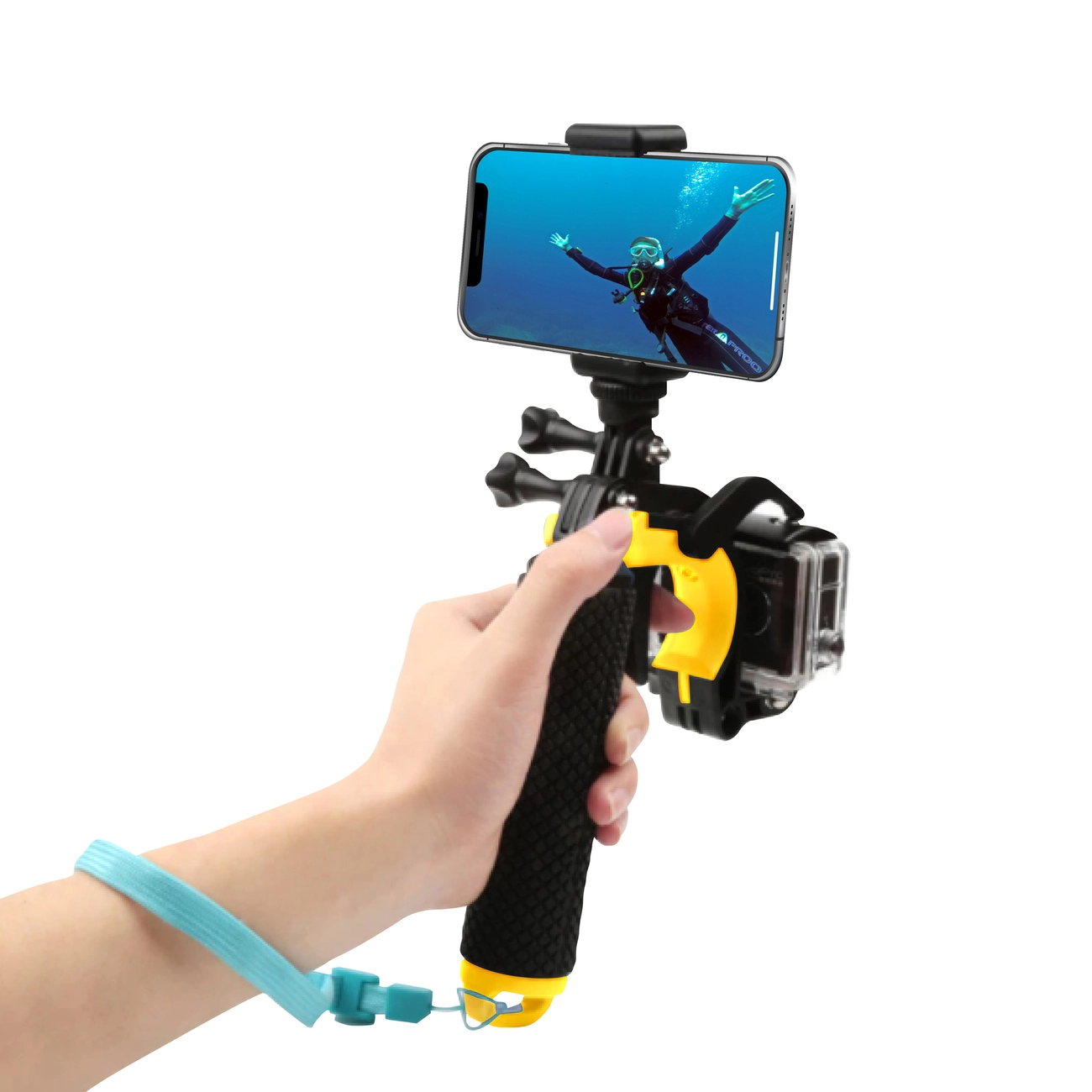 Крепление для камеры и смартфона также оборудовано нескользящей ручкой-поплавком. Это значит, что можно создавать крутые видео и фото не только одновременно на суше, но и в воде. В ручке присутствует небольшое внутреннее хранилище для важных мелких вещей, которые не хочется потерять во время прогулки или заплыва.