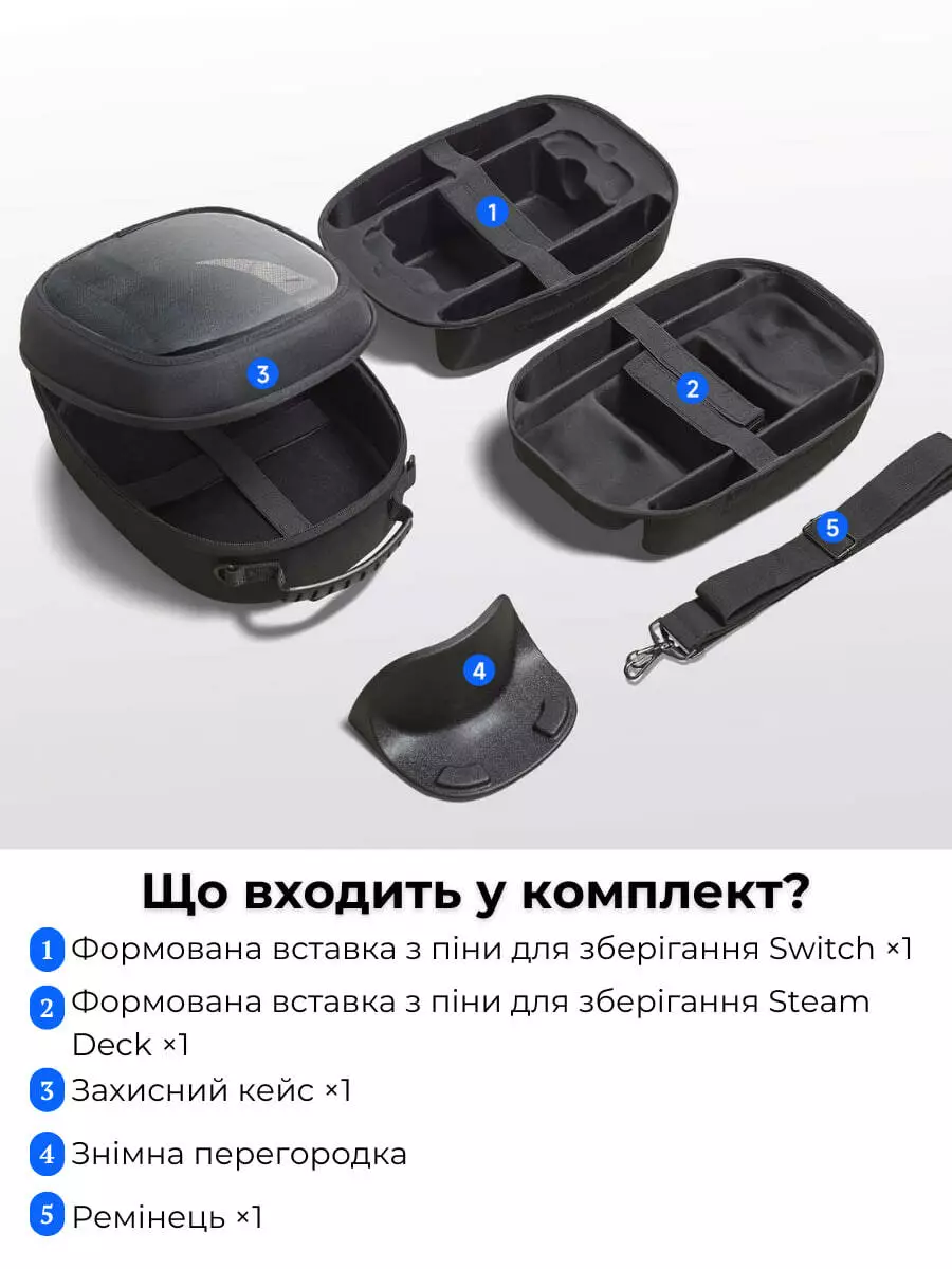 Комплектация: В комплекте вы получите футляр для переноса, ремень, съемный разделитель и два формованных держателя из пенопласта для портативных игровых консолей.
